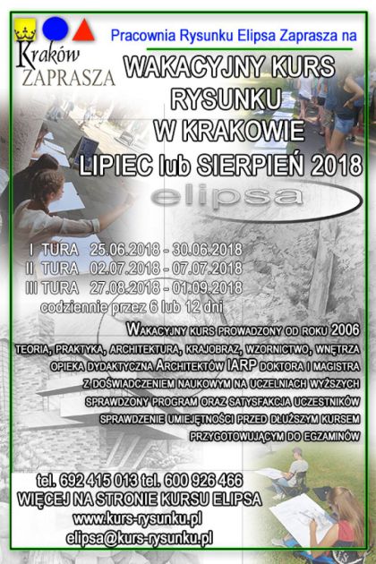 Dla osb cakowicie pocztkujcych, chccych zacz prac przed duszym kursem, aby mie podstawy rysunkowe, a take osb zainteresowanych rysunkiem odrcznym i rysunkiem architektonicznym przygotowalimy tematyk stosown do wybranego lub planowanego kierunku studiw. Wakacyjny kurs rysunku jest rwnie doskonaym sposobem na zwiedzenie Krakowa i spdzenie czasu dla osb z poza miasta. Rysujemy obiekty zabytkowe, a take ziele parkow i architektur wspczesn oraz tematy z zaj caorocznych i tematy egzaminacyjne m.in. podstawy perspektywy, zasady tworzenia bry prostych, modelowanie bry w rysunku itp.