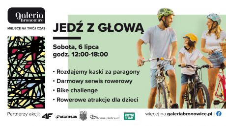Akcja „Jedź z głową” ma na celu promowanie miejskiej kultury rowerowej oraz zachęcenie mieszkańców Krakowa i okolicznych miejscowości do aktywnego spędzania czasu. Wydarzenie zostanie zrealizowane w Galerii Bronowice. Centrum handlowe dla swoich sąsiadów przygotowało szkolenia i pokazy BMX, prowadzone przez przedstawicieli BMX SCHOOL, tematyczne gry i zabawy oraz malowanie buziek. W sobotę, 6 lipca, powstanie tu także strefa BIKE CHALLANGE, gdzie na rowerzystów w kreatywnych strojach sportowych czekać będą pakiety upominkowe, składające się z plecaka-worka, bidonu i opaski odblaskowej.