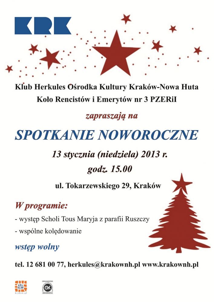 Klub Herkules Oœrodka Kultury Kraków-Nowa Huta (ul. Tokarzewskiego 29) zaprasza 13 stycznia 2013 r. o godz. 15.00 na Spotkanie Noworoczne.