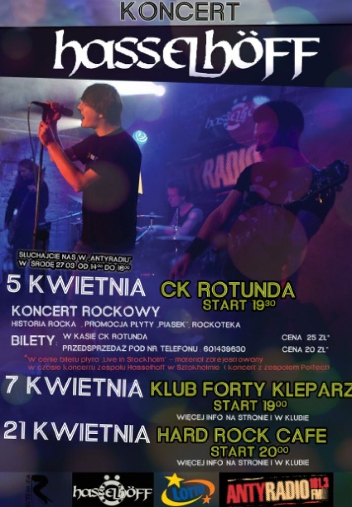 Powstanie naszego zespołu ,, Hasselhoff datuje się na padziernik 2010. Przez cały czas istnienia pracujemy nad rozwijaniem tylko autorskiego repertuaru. W czerwcu 2011 uformował się ostateczny skład zespołu. W sierpniu zyskalimy możliwoć zarejestrowania debiutanckiego EP "Piasek" i wydania go w Łódzkiej wytwórni Dalmafon . W 2012 r. gralimy koncerty w klubach oraz na imprezach plenerowych w Krakowie i jego okolicach, uczestniczšc m. in. w przeglšdzie kapel studenckich Rockrebel w krakowskim klubie Żaczek. Pod koniec roku / 7.10.2012/ udało nam się zagrać, wraz ze słynnym zespołem Perfect, pierwszy międzynarodowy koncert na dużej scenie w klubie Tyrol w Sztokholmie. Impreza ta była dla nas szczególnie ważna, ponieważ podczas jej trwania nastšpiła promocja naszej debiutanckiej płyty.