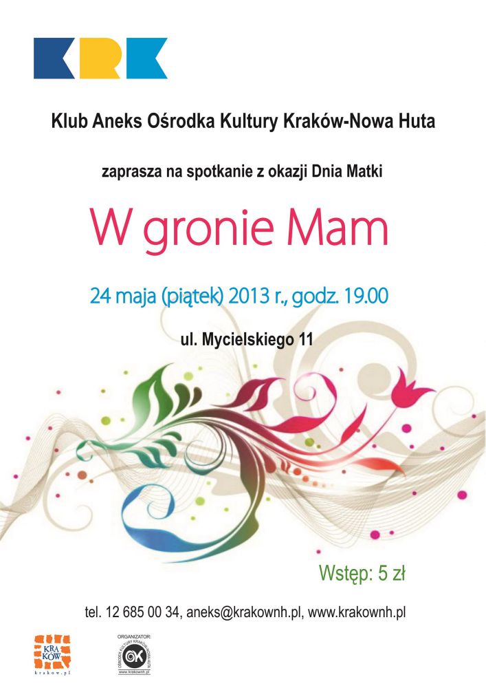 Dzień Matki to najcieplejsze ze œwišt w całym roku. Jak co roku w Klubie Aneks Oœrodka Kultury Kraków-Nowa Huta(ul. Mycielskiego 11) odbędzie się spotkanie okolicznoœciowe z tej okazji. Zapraszamy 24 maja o godz. 19.00 uczestniczki zajęć klubowych, mamy dzieci uczęszczajšcych na zajęcia oraz mieszkanki Łuczanowic na wspólne spotkanie przy kawie i ciasteczku.