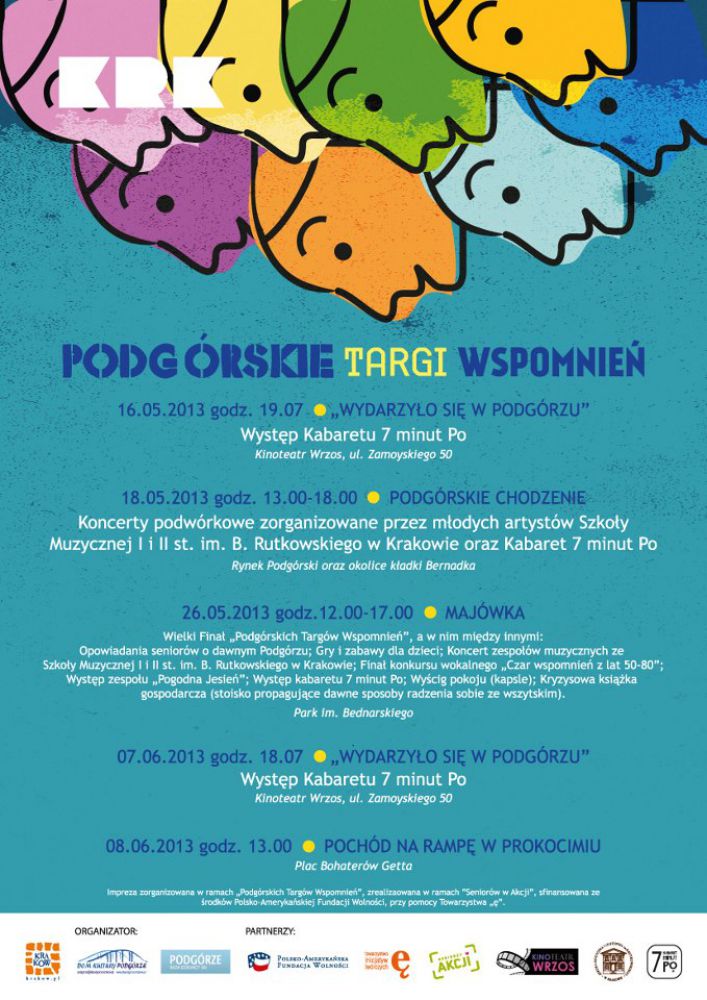 16 maja 2013 godz. 1807 kinoteatr „Wrzos” ul. Zamoyskiego 50. „Wydarzyło się w Podgórzu” Występ kabaretu „7 minut Po” (zdobywcy grand prix, nagrody dziennikarzy i nagrody publicznoœci Paka 2013), ze specjalnie przygotowanym programem zwišzanym z dzielnicš Podgórze. Wystšpiš również uczniowie Szkoły Muzycznej im. B. Rutkowskiego z Podgórza.