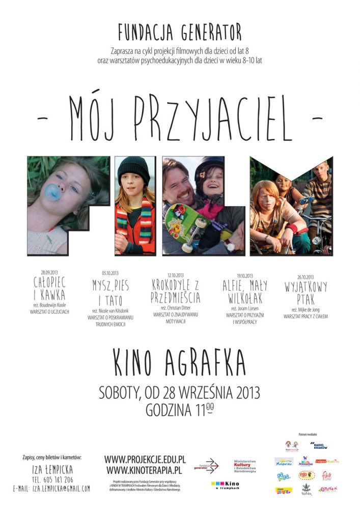 W dniach 28 wrzeœnia – 26 paŸdziernika, w formie cotygodniowych spotkań odbędš się warsztaty w dziesięciu miastach Polski. W Krakowie, od 28 wrzeœnia, zapraszamy do kina Agrafka. Każde spotkanie obejmie pokaz specjalnie dobranego filmu fabularnego oraz warsztat psychoedukacyjny. Ma on na celu wspieranie dzieci w rozwoju umiejętnoœci społecznych