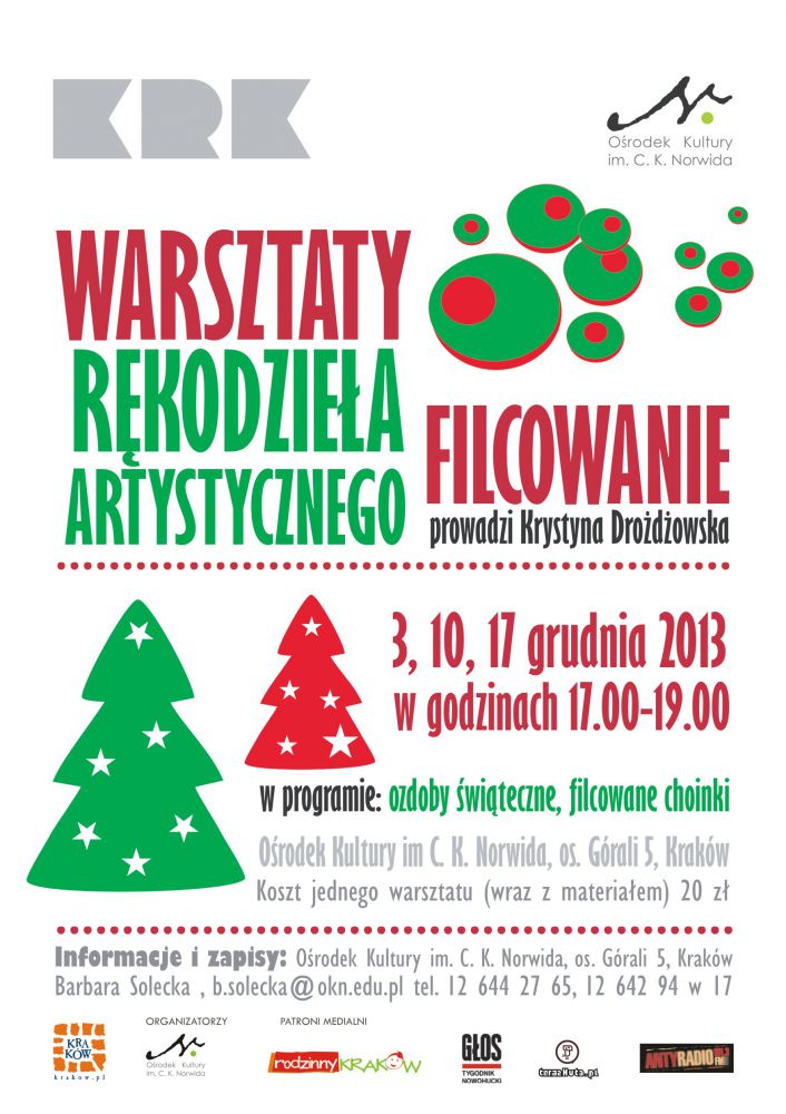 Zapraszamy na warsztaty rękodzieła artystycznego, na grudniowych spotkaniach będziemy tworzyć ozdoby œwišteczne (kule œniegowe, bombki w sweterku na sucho) i filcowane choinki.