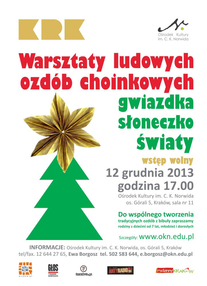 Orodek Kultury im. C. K. Norwida zaprasza we czwartek 12.XII o godz.17.00 rodziny z dziećmi od 7 lat oraz młodzież i dorosłych. Zapewniamy potrzebne do wykonania ozdób materiały. Warsztaty prowadzi Ewa Borgosz.