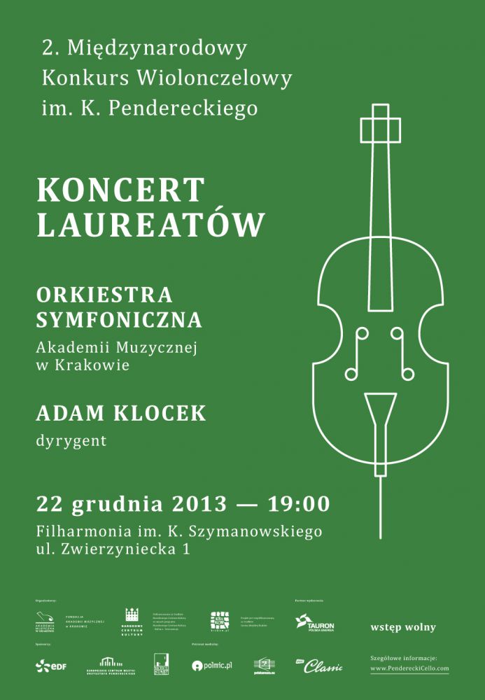22 grudnia (niedziela) o godz. 19:00 w Filharmonii im. K. Szymanowskiego w Krakowie odbędzie się koncert Laureatów 2. Międzynarodowego Konkursu Wiolonczelowego im. K. Pendereckiego.