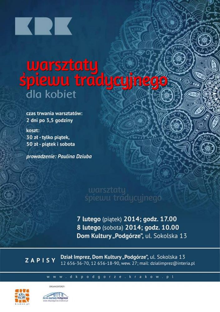 W DK Podgórze odbędzie się spotkanie ze œpiewem tradycyjnym (zwanym białym). Ta technika œpiewu naturalnego, pełnym głosem - charakterystyczna dla pieœni ludowych, daje niesamowite możliwoœci ekspresji i emisji głosu.
