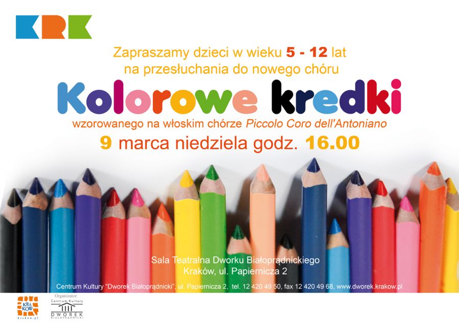 Na wzór tych małych œpiewaków, w Centrum Kultury „Dworek Białopršdnicki” stworzony zostanie chór dziecięcy „Kolorowe Kredki”, który prowadzi Aleksandra Nowak. Na przesłuchania, które odbędš się w niedzielę (9 marca) o godz. 16:00, organizatorzy zapraszajš dzieci w wieku 5 – 12 lat. Udział w chórze będzie bezpłatny.