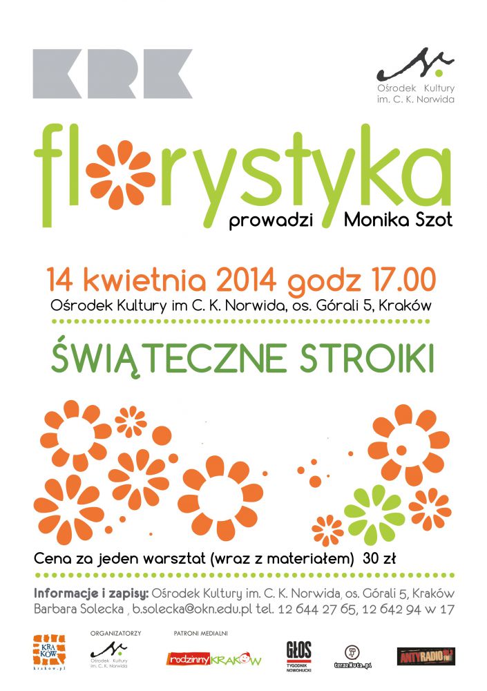 Prowadzi florystyka Monika Szot. - dyplomowana florystka, która swojš pasjš do kwiatów potrafi zarazić wszystkich dookoła. Warsztaty pozwolš zdobyć umiejętnoœci tworzenia różnorodnych kompozycji z kwiatów, dekorowania stołu i pomieszczeń. Zapoznajš uczestników z zasadami kompozycji, pozwolš poznać różnorodne możliwoœci użycia materiału roœlinnego, doboru kolorów, dodatków i innych elementów decydujšcych o efektownej dekoracji florystycznej.