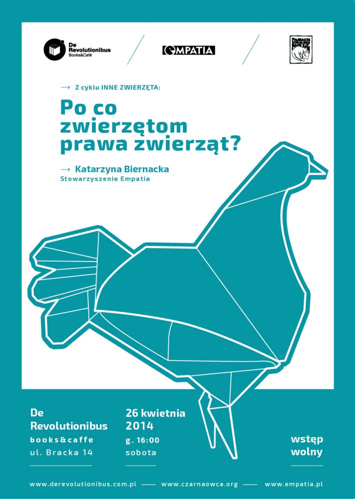 Fundacja Czarna Owca Pana Kota we współpracy ze Stowarzyszeniem Empatia i księgarniš De Revolutionibus. Books&Cafe zaprasza na spotkanie z Katarzynš Biernackš Po co zwierzętom prawa zwierzšt?.