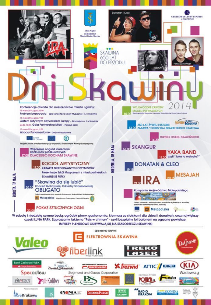 Jubileuszowy rok zasługuje na wiele atrakcji, dlatego też przygotowalimy niecodzienny i bogaty program, który uwietni 650-lecie nadania Praw Miejskich Skawinie. Już dzisiaj, 17 i 18 maja warto zarezerwować na Dni Skawiny 2014 r.