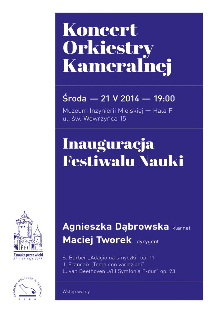 Wystšpiš Orkiestra Kameralna Akademii Muzycznej w Krakowie pod dyrekcjš Macieja Tworka. Jako solistka wystšpi klarnecistka Agnieszka Dšbrowska, studentka pierwszego roku studiów drugiego stopnia w klasie prof. Andrzeja Godka oraz dr. Piotra Lato. Na program koncertu złożš się utwory: słynne Adagio na smyczki Samuela Barbera, Tema con variazioni (wersja na klarnet i orkiestrę smyczkowš) Jeana René Désiré Françaixa oraz VIII Symfonia F-dur op. 93 Ludwiga van Beethovena.