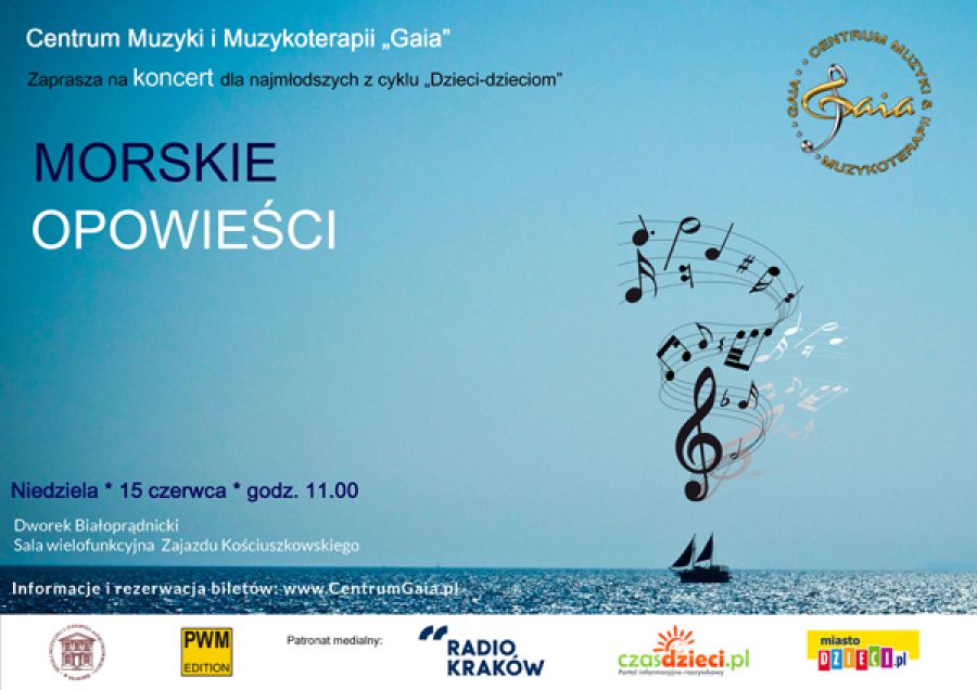 15 czerwca o godz. 11.00 Centrum Muzyki i Muzykoterapii Gaia zaprasza na kolejny koncert z cyklu Dzieci-dzieciom, zatytułowany Morskie opowieci. Opowiemy muzyczne historie z dalekich krajów, zatańczymy na pokładzie i pokołyszemy się przy prawdziwych szantach. Zachęcamy dużych i małych goci do przebrania się w marynarskie stroje, niech już nas wołajš wakacje, ahoj!