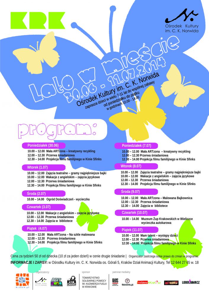Przed nami lipiec ulubiony i wyczekany przez dzieci miesišc. To czas długich ciepłych dni, zabawy, beztroski i odpoczynku. Wiele z Was wyjedzie ale tym, którzy zostanš w lipcu w Nowej Hucie też nie damy się nudzić. Orodek Kultury im. C. K. Norwida (os. Górali 5) zaprasza dzieci w wieku 7-11 lat na Lato w Miecie. Przez dwa tygodnie, od poniedziałku do pištku, od 10.00 do 14.00 będziemy Was bawić i rozwijać Waszš kreatywnoć na wiele sposobów. Będš artrecyklingowe warsztaty w Małej ARTzonie, teatralne przygody ze scenš, wakacyjny angielski na wesoło, ksišżkowe tajemnice w bibliotece, na szkle malowanie i malowana bajkownica, wakacyjne seanse w Kinie Sfinks, dowiadczanie w Ogrodzie Dowiadczeń i wyprawa autokarowa do Muzeum Żup Krakowskich w Wieliczce. Codziennie będzie czekała na Was wesoła ekipa animatorów, grupa rówieników a jak zgłodniejecie w trakcie zabawy wieżutkie drożdżówki i napoje. Serdecznie zapraszamy, koszt 10 zł od dziecka za dzień, szczegółowe informacje i zapisy: os. Górali 5, tel. 12 644 27 65, szczegółowy program na stronie www.okn.edu.pl