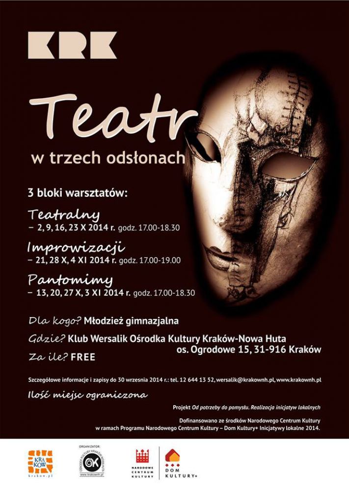 Klub Wersalik Orodka Kultury Kraków-Nowa Huta (os. Ogrodowe 15) zaprasza gimnazjalistów do udziału bezpłatnych warsztatach Teatr w trzech odsłonach, organizowanych jako jedna z inicjatyw w ramach projektu Od potrzeby do pomysłu. Realizacja inicjatyw lokalnych. Autorami pomysłu sš: Emilia Wysocka, Natalia Jarosik, Zuzanna Kubal, Artur Siudak.