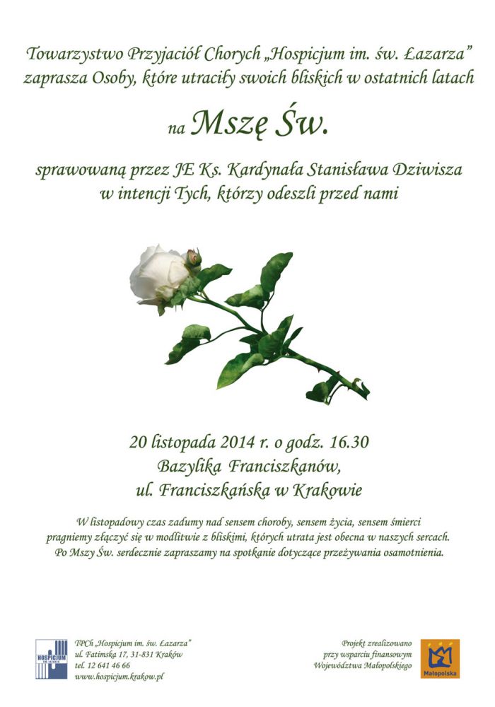 Towarzystwo Przyjaciół Chorych Hospicjum im. w. Łazarza" zaprasza Osoby, które utraciły swoich bliskich w ostatnich latach