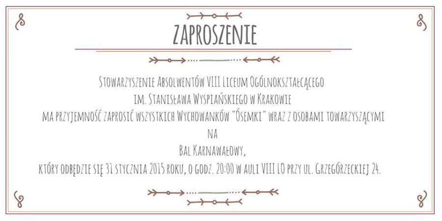 31 stycznia 2015r. w VIII Liceum Ogólnokształcšcym im. Stanisława Wyspiańskiego przy ul. Grzegórzeckiej 24 w Krakowie odbędzie się Bal Absolwentów Ósemki. Będzie to doskonała okazja nie tylko do odnowienia kontaktów z kolegami i koleżankami z czasów licealnych oraz integracji rodowiska absolwenckiego, ale także do refleksji nad niemal 60-letniš historiš szkoły.