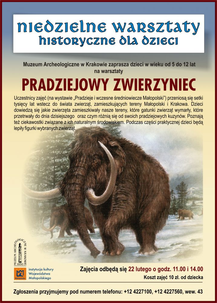 Uczestnicy zajęć (na wystawie Pradzieje i wczesne redniowiecze Małopolski) przeniosš się setki tysięcy lat wstecz do wiata zwierzšt, zamieszkujšcych tereny Małopolski i Krakowa. Dzieci dowiedzš się jakie zwierzęta zamieszkiwały nasze tereny, które gatunki zwierzšt wymarły, które przetrwały do dnia dzisiejszego oraz czym różniš się od swoich pradziejowych kuzynów. Poznajš też ciekawostki zwišzane z ich naturalnym rodowiskiem. Podczas częci praktycznej dzieci będš lepiły figurki wybranych zwierzšt.