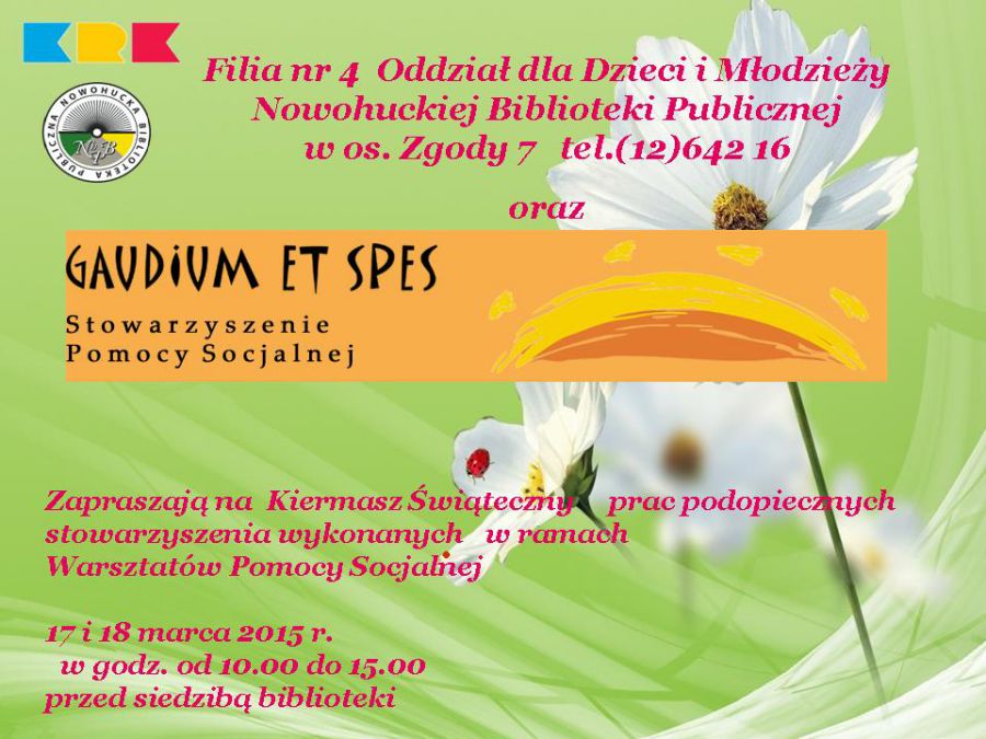 W cyklu: Spotkajmy się w bibliotece Filia nr 4 zaprasza na wystawę i kiermasz prac plastycznych podopiecznych Stowarzyszenia Pomocy Socjalnej Gaudium et Spes. Wystawiane prace będš zwišzane z tematykš wištecznš. wišteczne rękodzieło może być miłym prezentem dla rodziny i przyjaciół, kupujšc prace wspieramy ich autorów.