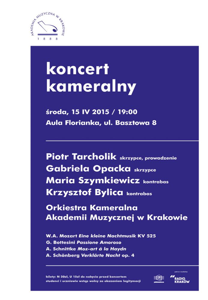 W rod 15 kwietnia o godzinie 19:00 w Auli Florianka przy ul. Basztowej 8 Orkiestra Kameralna pod dyrekcj Piotra Tarcholika zaprezentuje jedno z najbardziej znanych dzie W.A. Mozarta Eine kleine Nachtmusik. Ponadto w programie znajd si utwory kompozytorw reprezentujcych pniejsze epoki: G. Bottesiniego Passione Amoroso na 2 kontrabasy oraz A. Schnittkego Moz-art la Haydn na dwoje skrzypiec i orkiestr kameraln. Solistami bd: Maria Szymkiewicz i Krzysztof Bylica (kontrabas) oraz Gabriela Opacka (skrzypce).