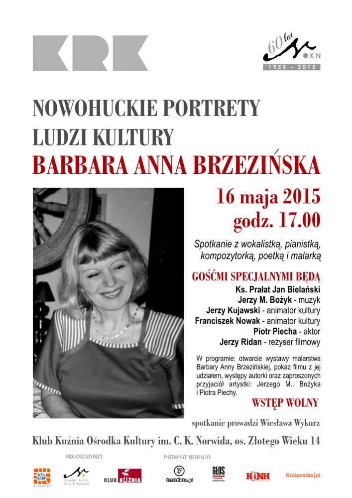 Goœciem majowego spotkania z cyklu Nowohuckie portrety ludzi kultury będzie Barbara Anna Brzezińska – wokalistka, pianistka, kompozytorka, poetka i malarka.