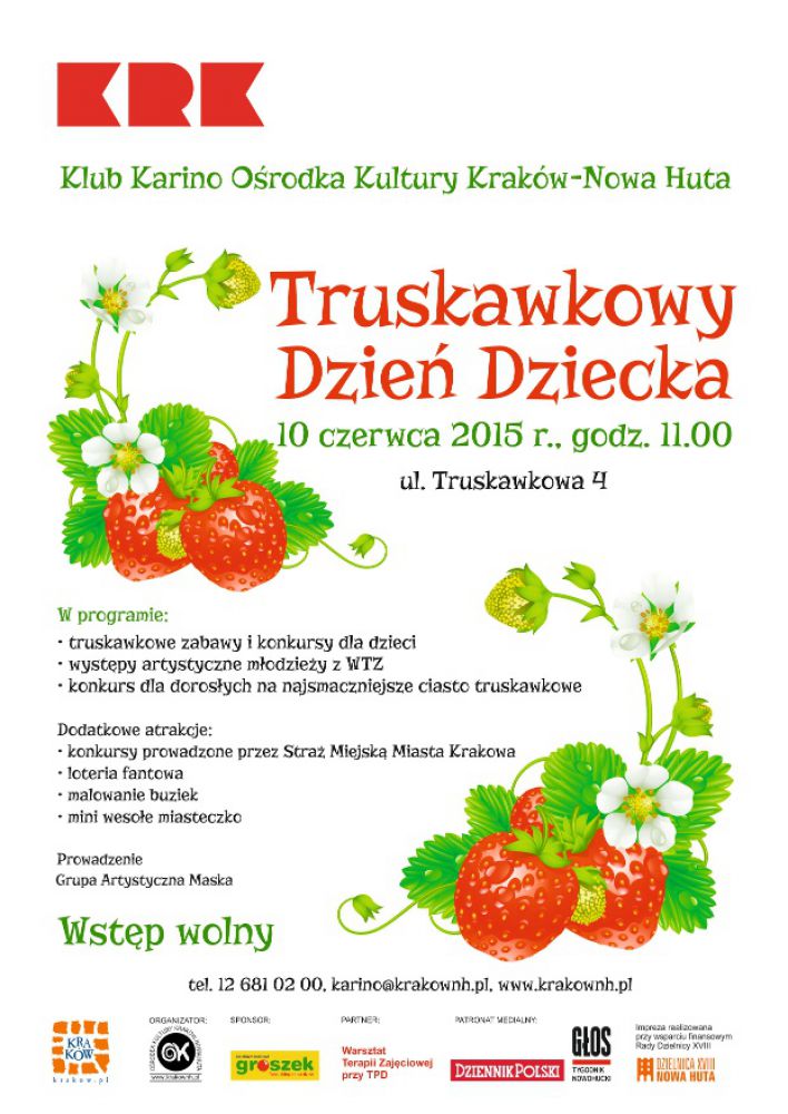 Klub Karino Orodka Kultury Kraków-Nowa Huta (ul. Truskawkowa 4) zaprasza 10 czerwca o godz. 11.00 na najsmaczniejszy i najzdrowszy festyn rodzinny w całym Krakowie! Jak co roku Klub Karino zapewnia moc atrakcji i zaprasza na wspólne więtowanie. Będš zabawy dla najmłodszych oraz bezpłatne wesołe miasteczko, a dla dorosłych konkurs kulinarny na najsmaczniejsze ciasto truskawkowe. W tym dniu królować będš TRUSKAWKI. Regulamin i karta zgłoszenia do pobrania na www.krakownh.pl.