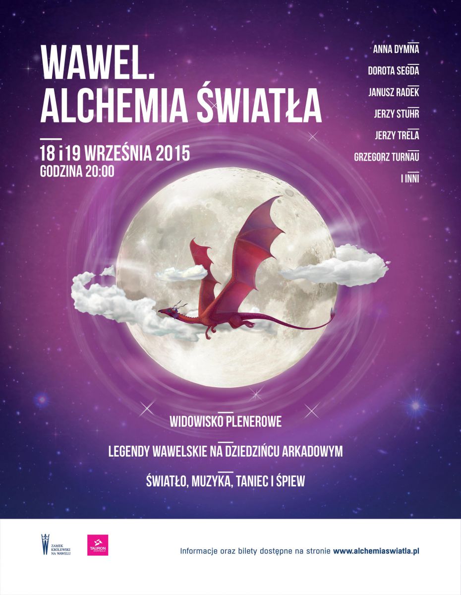 W multimedialnym widowisku Wawel. Alchemia wiatła legendy i podania zwišzane z Zamkiem Królewskim na Wawelu ożyjš w autentycznej scenerii zamku za sprawš innowacyjnej formy, wykorzystujšcej m.in. visual art i 3D mapping. Będzie to swoista synteza sztuk, łšczšca muzykę na żywo, malarstwo i trójwymiarowe obrazy, taniec, piew oraz słowo. W widowisku wezmš udział wybitni artyci: aktorzy, tancerze, muzycy, specjalici od multimediów i wiatła.