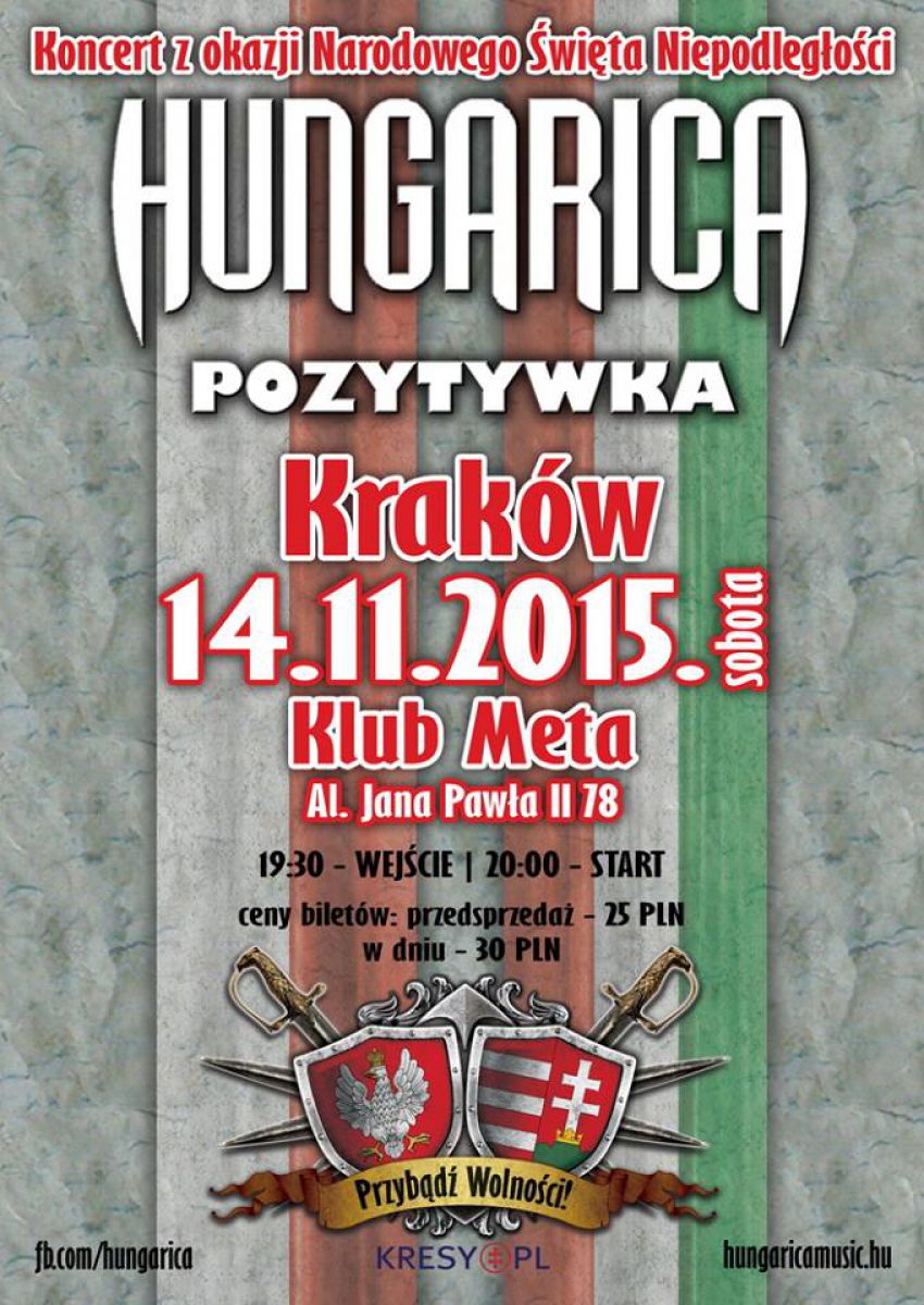 14 listopada odbędzie się w Krakowie koncert węgierskiego zespołu Hungarica, jednego z najbardziej znanych zespołów rockowych na Węgrzech, który propaguje przyjań polsko-węgierskš, a ostatnio nagrał płytę z utworami w języku polskim z udziałem polskich wykonawców sceny rockowej, m.in. Andrzejem Nowakiem (TSA). Zespół zaproszony został na występy w Polsce z okazji naszego Narodowego więta i wystšpi w Warszawie, widniku, rodzie lšskiej oraz Krakowie wraz z polskim zespołem Pozytywka. Wykonawcom gocinnie towarzyszyć będzie wokalistka Edyta Szkołut.