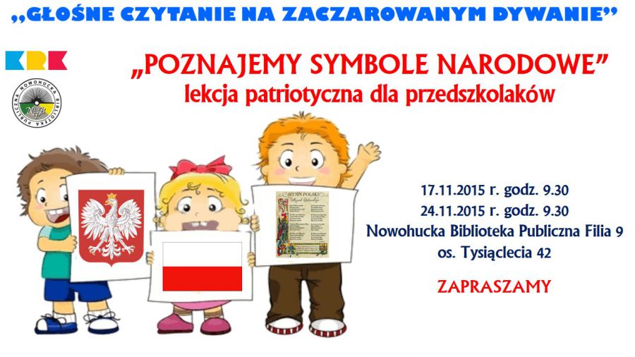 Biblioteka zaprasza dzieci w wieku przedszkolnym na lekcję patriotycznš Poznajemy symbole narodowe w cyklu: Głone czytanie na zaczarowanym dywanie. Podczas zajęć przedszkolaki poznajš symbole narodowe: flagę, godło, hymn oraz ich historię. Zajęcia zostanš przeprowadzone w oparciu o ksišżkę Poradnik małego patrioty Marcina Przewoniaka. Jak sam tytuł sugeruje, jej głównym tematem jest patriotyzm. Dla dziecka rozpoczynajšcego edukację zarówno słowo jak i zagadnienie "patriotyzm" jest nieznane i może wydawać się czym niezwykle trudnym i należšcym do wiata dorosłych. Marcin Przewoniak wprowadza młodego czytelnika w to zagadnienie w bardzo przystępny sposób.