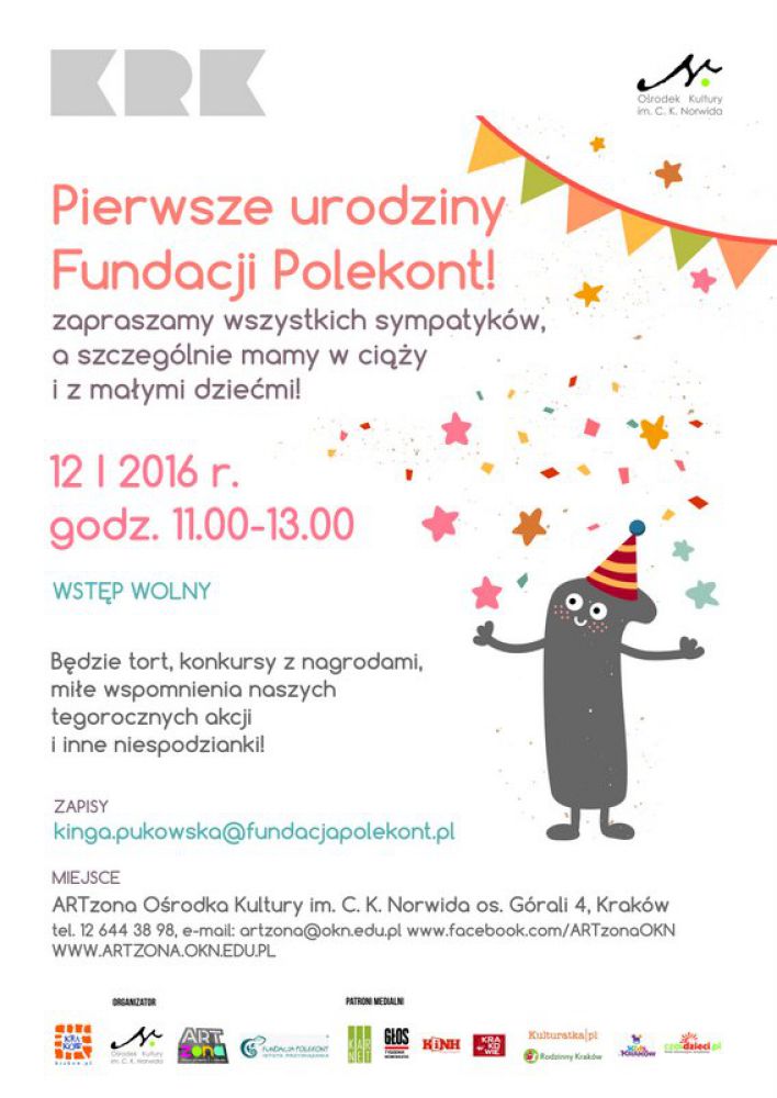 Pierwsze urodziny Fundacji Polekont! Z tej okazji zapraszamy na spotkanie wszystkich sympatyków, a szczególnie mamy w cišży i z małymi dziećmi. Będzie tort, konkursy z nagrodami, miłe wspomnienia naszych tegorocznych akcji i inne niespodzianki!