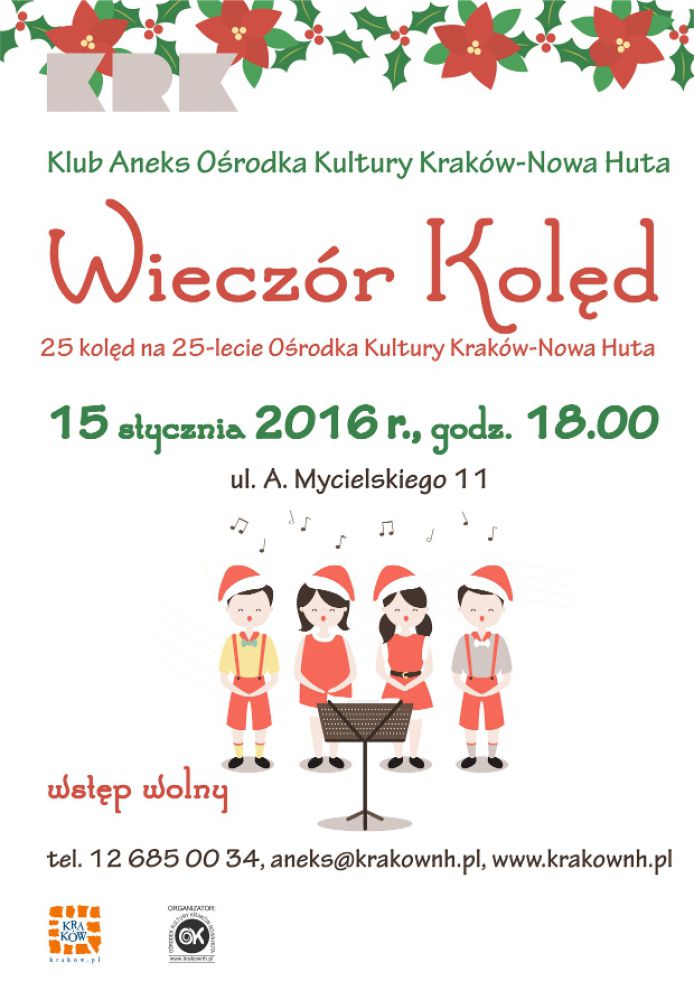 Kolędy œpiewane sš w Polsce powszechnie w okresie Bożego Narodzenia. Dlatego co roku w tym czasie spotykamy się w Klubie Aneks Oœrodka Kultury Kraków-Nowa Huta (ul. A. Mycielskiego 11), by wspólnie podtrzymywać ten piękny zwyczaj. Wspaniałš atmosferę podczas wieczoru kolęd tworzš przychodzšce całe rodziny: babcie, dziadkowie, rodzice oraz dzieci, dzięki czemu możliwa jest integracja międzypokoleniowa. W tym roku, 15 stycznia o godz. 18.00 uczestnicy zajęć nauki gry na gitarze wspólnie z instruktorem Panem Dariuszem Sobańskim, oczywiœcie wspomagani przez wszystkich przybyłych, wykonajš 25 kolęd i pastorałek na 25-lecie Oœrodka Kultury Kraków-Nowa Huta.