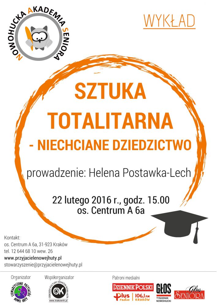 Podczas kolejnego spotkania w ramach Nowohuckiej Akademii Seniora (os. Centrum A 6a), które odbędzie się 22 lutego o godz. 15.00, słuchacze wysłuchajš wykładu z zakresu historii sztuki. Jego tematem będzie sztuka, która powstała pod wpływem panujšcych systemów totalitarnych. Niosšca w sobie niejednokrotnie wysokie wartoci estetyczne, staje się jednak w ogólnym przekonaniu dziedzictwem niechcianym, odrzucanym. O dziełach sztuki totalitarnej, ich wartoci historycznej oraz o tym czy należy je chronić czy raczej usuwać opowie Helena Postawka-Lech. Organizatorzy: Stowarzyszenie Przyjaciół Nowej Huty i Orodek Kultury Kraków-Nowa Huta.