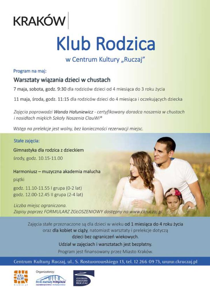 Klub Rodzica w CK Ruczaj oferuje rodzicom bezpłatne warsztaty, spotkania ze specjalistami oraz zajęcia - gimnastykę dla rodzica z dzieckiem oraz zajęcia umuzykalniajšce Harmoniusz. Więcej szczegółów na www.ckruczaj.pl oraz na www.facebok.com/CK.Ruczaj.
