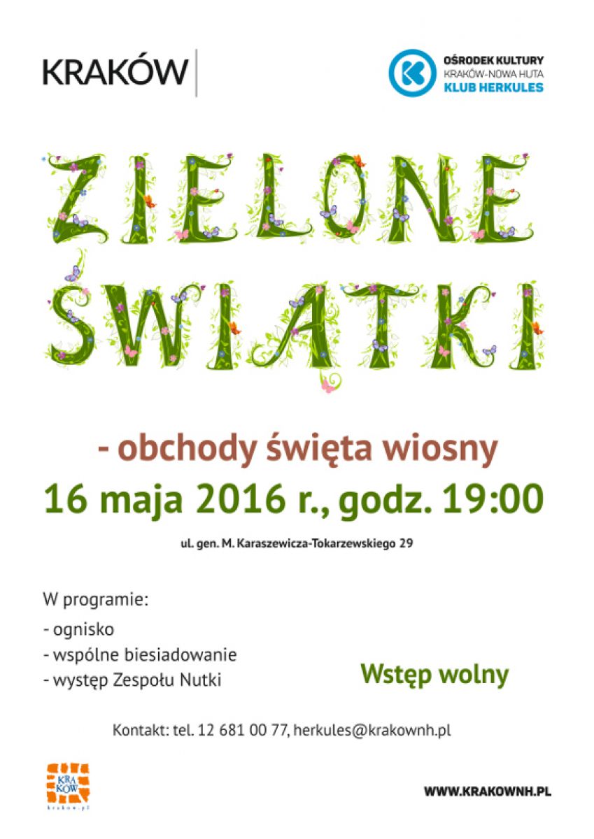 Klub Herkules Orodka Kultury Kraków-Nowa Huta (ul. gen. M. Karaszewicza-Tokarzewskiego 29) serdecznie zaprasza na tradycyjne obchody więta wiosny, czyli tzw. Zielone wištki, które odbędš się 16 maja o godz. 19:00. Impreza powięcona będzie przybliżeniu zwyczajów zwišzanych z Sobótkami. Uczestników zachęcamy do wspólnego dekorowania domów oraz Klubu zielonymi gałšzkami, po którym nastšpi ognisko. Wydarzeniu towarzyszyć będzie wspólne biesiadowanie i zabawy. Podczas imprezy wystšpi zespół Nutki z programem artystycznym. Spotkanie organizowane jest wspólnie z Klubem Seniora.