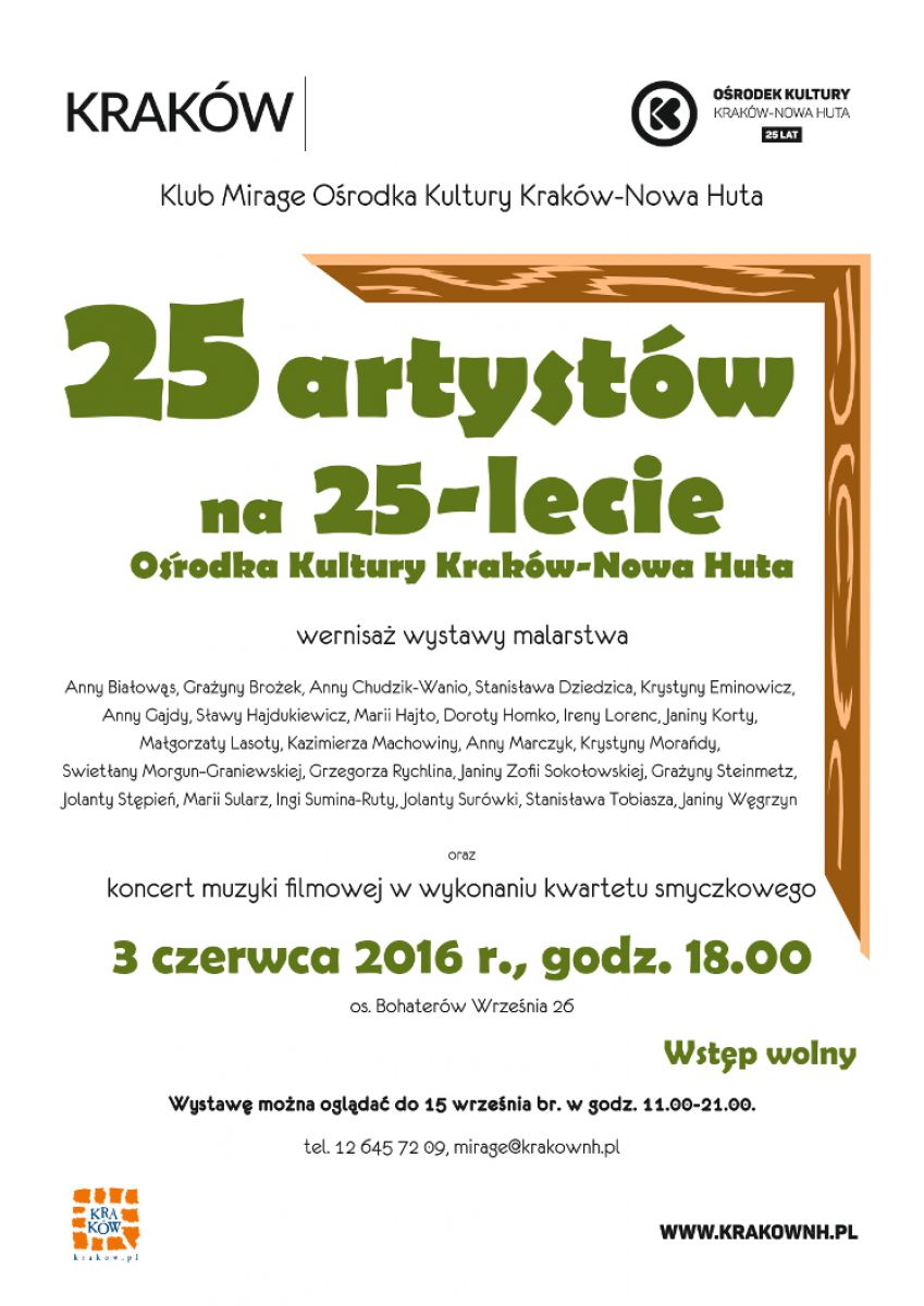 Klub Mirage Orodka Kultury Kraków-Nowa Huta (os. Bohaterów Wrzenia 26) serdecznie zaprasza na wernisaż niezwykłej wystawy malarstwa i fotografii 25 artystów z okazji jubileuszu 25-lecia Orodka Kultury Kraków-Nowa Huta, który odbędzie się 3 czerwca o godz. 18:00. Podczas wernisażu odbędzie się koncert kwartetu smyczkowego pod batutš Martyny Drabczyńskiej.
