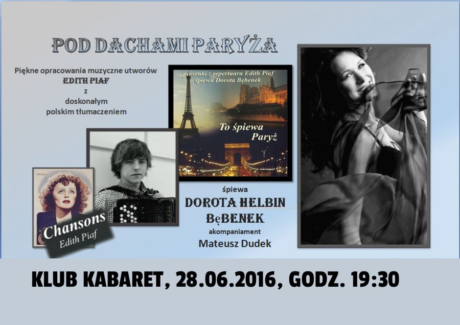 Piosenki z repertuaru Edith Piaf z akompaniamentem Mateusza Dudka (akordeon) zaprezentuje w najbliszy wtorek na scenie Klubu Kabaret Dorota Helbin Bbenek. To piewa Pary!