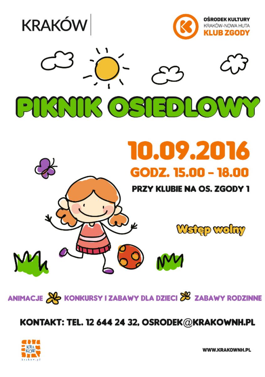 Piknik osiedlowy to doskonały sposób na spędzanie wolnego czasu w gronie rówieników, sšsiadów, rodzin z dziećmi. Zachęca do aktywnoci fizycznej na wieżym powietrzu, a także do wspólnych rozmów. Podczas pikniku organizowanego przez Klub Zgody Orodka Kultury Kraków-Nowa Huta (os. Zgody 1) który odbędzie się 10.09 w godz. 15.00-18.00 przy klubie, dzieci będš mogły wzišć udział w warsztatach plastycznych, w konkurencjach sportowych: rzucie do kosza, wycigach w workach czy kręglach. Będzie też puszczanie baniek mydlanych i skręcanie baloników oraz malowanie buziek a na najmłodszych czekać będzie kšcik plastyczny. Atrakcjš będš zabawy z chustš animacyjnš. Rodzice będš mogli też pobawić się razem z dziećmi oraz zagrać w gry stolikowe.