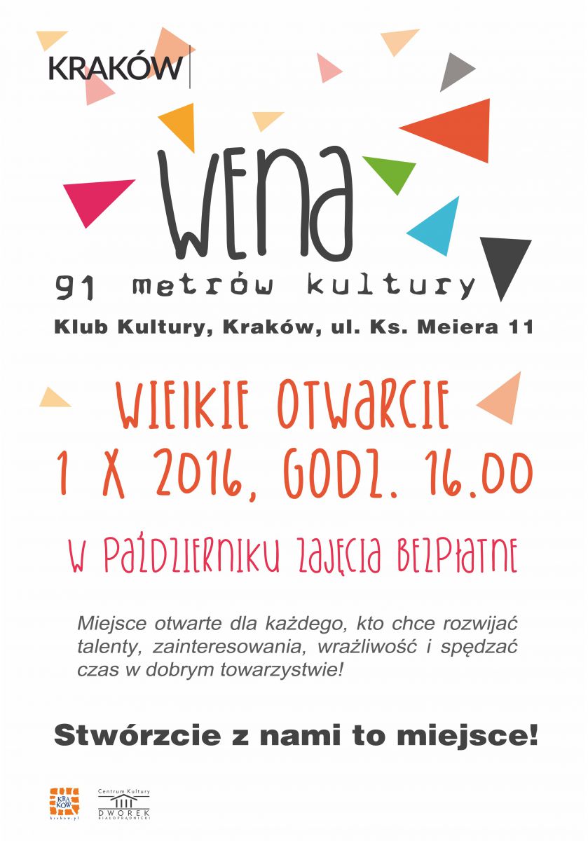 W najbliższš sobotę, 1 padziernika na kulturalnej mapie Krakowa pojawi się nowe miejsce, gdzie będzie można rozwijać talenty, zainteresowania, wrażliwoć, po prostu: dobrze i twórczo spędzać czas! Na osiedlu Gotyk, przy ul. ks. Meiera 11, rusza Klub Kultury Wena - filia Centrum Kultury Dworek Białopršdnicki. Uroczyste otwarcie klubu rozpocznie się radosnym korowodem ulicami Osiedla Gotyk o godz. 15.30. UWAGA! W padzierniku zajęcia będš bezpłatne!