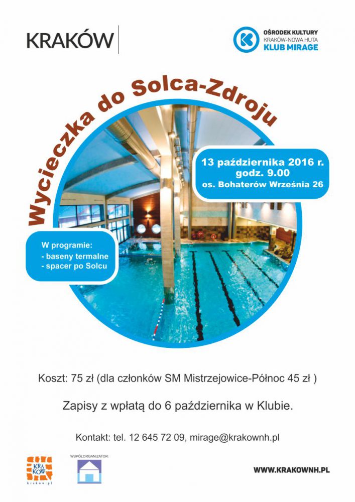 Klub Mirage Orodka Kultury Kraków-Nowa Huta (os. Bohaterów Wrzenia 26) zaprasza seniorów na wycieczkę autokarowš na baseny termalne do Solca Zdroju w dniu 13 padziernika. Uzdrowisko Solec Zdrój położone jest w niezwykle malowniczym regionie województwa więtokrzyskiego, a jego najcenniejszym bogactwem naturalnym sš lecznicze wody. W programie wycieczki do Solca znajdzie się: 2,5 godzinny pobyt na Basenach Mineralnych Solec Zdrój oraz spacer po Solcu. Zapisy i wpłaty przyjmowane sš w Klubie do 6 padziernika. Wyjazd spod Klubu o godz. 9.00.