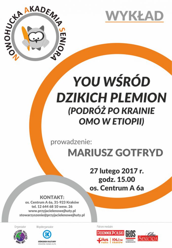 Nowohucka Akademia Seniora (os. Centrum A 6a) zaprasza na wykład w poniedziałek 27 lutego o godz. 15.00. "You wród dzikich plemion" to multimedialna podróż po Etiopii, którš zamieszkujš najdziksze plemiona Afryki: Konso, Mursi czy Hamerowie, którzy do niedawna nie wiedzieli nawet o istnieniu kontynentu Afrykańskiego. Autor podczas swojego pobytu poznawał ich kulturę i obyczaje. Pokaz wzbogacony zostanie eksponatami - pamištkami podarowanymi autorowi przez rdzennych mieszkańców. Wykład dla Nowohuckiej Akademii Seniora poprowadzi Mariusz Gotfryd podróżnik, nauczyciel geografii, autor przewodników. Organizatorami Nowohuckiej Akademii Seniora sš Stowarzyszenie Przyjaciół Nowej Huty oraz Orodek Kultury Kraków-Nowa Huta.