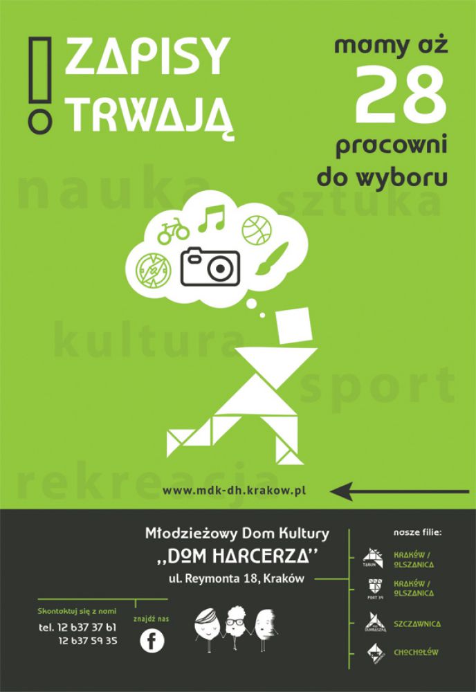 Z przyjemnociš informujemy, że zapisy na zajęcia w Młodzieżowym Domu Kultury Domu Harcerza przy ul. Reymonta 18 trwajš! Serdecznie zapraszamy wszystkich zainteresowanych do zapoznania się z naszš ofertš na www.mdk-dh.krakow.pl.