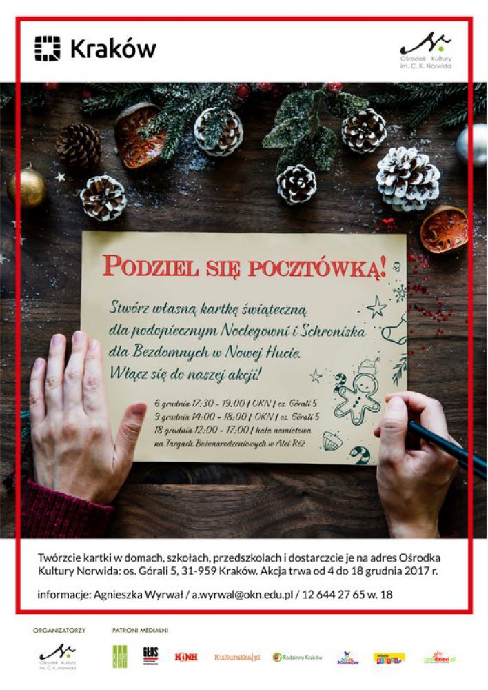 6 grudnia w godzinach 17:30-19:00 oraz 9 grudnia w godzinach 14:00 do 18:00 spotykamy się w Orodku Kultury im. C. K. Norwida w Krakowie, os. Górali 5.