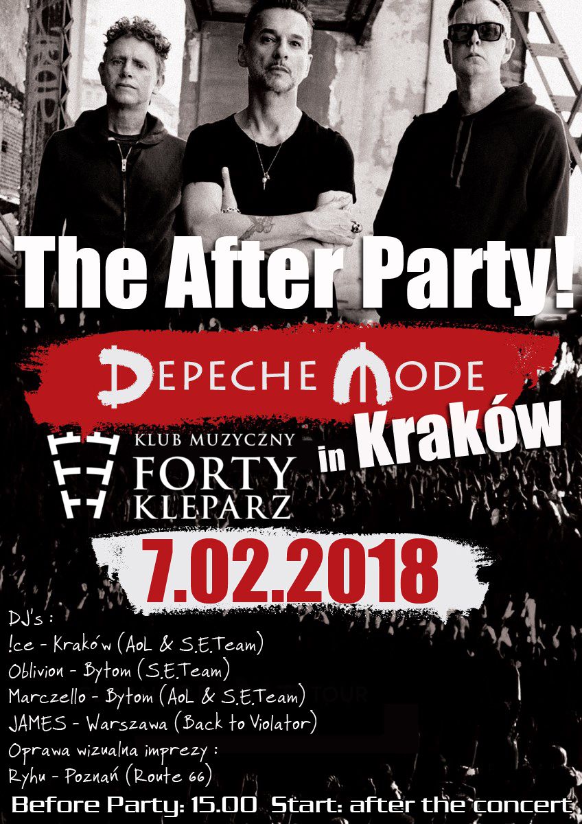 Po raz pierwszy w swojej koncertowej historii zespół Depeche Mode zawita do stolicy Małopolski, by w ramach trasy koncertowej Global Spirit Tour 7 lutego 2018 dać koncert w TAURON Arena Kraków. Wszystkich fanów, sympatyków muzyki i dokonań zespołu z Basildon zapraszamy na imprezę Depeche Mode Spirit Tour in Cracow - The AFTERPARTY! Impreza odbędzie się w znakomitym, krakowskim klubie FORTY KLEPARZ. Przed nami noc wypełniona muzykš legendarnego brytyjskiego zespołu. DJ'e zaprezentujš muzyczny dorobek Depeche Mode w wydaniach albumowych, koncertowych i mixach oraz solowe projekty członków zespołu. Nie zabraknie też dawki dobrych dŸwięków w klimatach pokrewnych. To będzie noc pełna doskonałych muzycznych wrażeń! Będziemy się bawić przy dŸwiękach ulubionego zespołu, ale after party to także niepowtarzalna okazja do towarzyskich spotkań fanów z całej Polski i Europy oraz wymiany wrażeńz Tauron Areny Kraków. Co ważne, wydarzenie nie jest wyłšcznie imprezš pokoncertowš: zapraszamy wszystkich również na muzycznš rozgrzewkę przed koncertem Depeche Mode. Już od godziny 15 otworzymy bramy klubu dla tych, którzy chcš wprowadzić się w dobry muzyczny nastrój w ramach tradycyjnego "bifora". Główna częœć imprezy The AFTERPARTY! wystartuje tuż po zakończeniu koncertu w TAURON Arena Kraków.