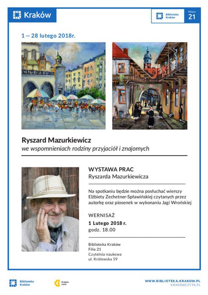 Wieczór wspomnień poœwięcony Ryszardowi Mazurkiewiczowi połšczony z wernisażem jego malarstwa. Na spotkaniu będzie można posłuchać wierszy Elżbiety Zechenter-Spławińskiej czytanych przez autorkę oraz piosenek w wykonaniu Jagi Wrońskiej.