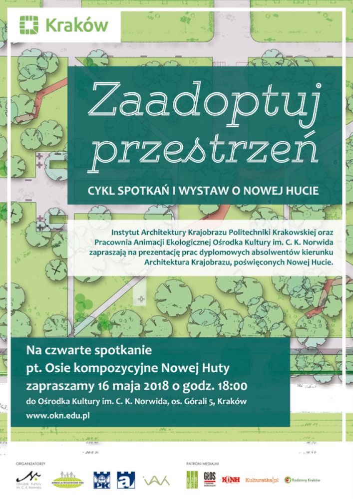 "ZAADOPTUJ PRZESTRZEŃ" to cykl tematycznych spotkań i wystaw, prezentujšcych prace dyplomowe studentów i absolwentów kierunku Architektura Krajobrazu Wydziału Architektury Politechniki Krakowskiej, powięconych różnym przestrzeniom publicznym Nowej Huty.