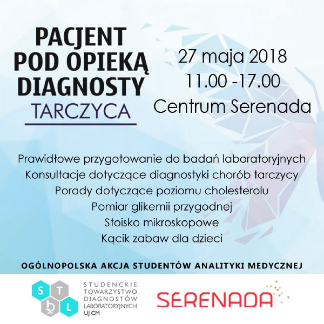 27 maja w Dzień Diagnosty Laboratoryjnego na terenie Centrum Serenada odbędzie się ogólnopolska akcja profilaktyczna Pacjent pod opiekš Diagnosty, która jest inicjatywš organizacji studenckich zrzeszajšcych studentów Analityki Medycznej z całej Polski. W Krakowie za organizację odpowiada Studenckie Towarzystwo Diagnostów Laboratoryjnych Collegium Medicum Uniwersytetu Jagiellońskiego. Akcja ma na celu pokazanie kim jest i czym zajmuje się diagnosta laboratoryjny, a także zwrócenie uwagi na prawidłowe przygotowanie do badań laboratoryjnych. Podczas wydarzenia będzie można zasięgnšć informacji dotyczšcych tarczycy, wykonywania pomiaru glikemii, poznać działanie mikroskopu oraz spotkać się z diagnostami. Akcja odbywa się w 11 największych miastach w Polsce i jej partnerami sš m.in. Krajowa Izba Diagnostów Laboratoryjnych, firma ALAB Laboratoria, firma Diagnostyka oraz firma Roche.