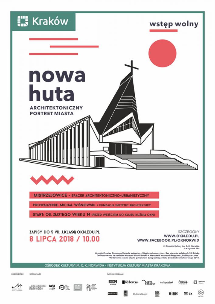 Nowa Huta architektoniczny portret miasta cykl działań animacyjno-edukacyjnych w postaci spacerów, zwiedzania lub prelekcji portretujšcych architektoniczne dziedzictwo kulturowe Nowej Huty z drugiej połowy XX w. W ramach przedsięwzięcia wydana zostanie recenzowana publikacja oraz zaprojektowane będš tzw. ikony miejskie, czyli schematyczne rysunki-piktogramy przedstawiajšce najważniejsze obiekty na bazie których powstanie seria gadżetów promujšcych lokalne dziedzictwo kulturowe.