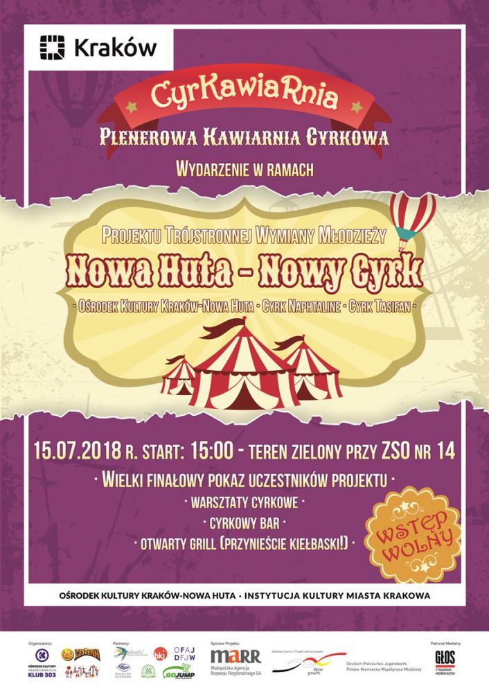 Klub 303 Oœrodka Kultury Kraków-Nowa Huta zaprasza 15 lipca 2018 r. o godz. 15:00 na teren zielony przy Zespole Szkół Ogólnokształcšcych nr 1 (os. Dywizjonu 303 nr 66) gdzie odbędzie się na CyrKawiaRnia. To rodzaj happeningu odbywajšcego się w przestrzeni osiedla Dywizjonu 303. Polega na stworzeniu plenerowej kawiarni cyrkowej, w której można zamówić bezalkoholowe napoje (podawane prze kelnerzy-szczudlarzy), posłuchać dobrej muzyki, spróbować swoich sił w dyscyplinach cyrkowych, wzišć udział w grach, zabawach, zrelaksować się i co najważniejsze - obejrzeć premierę cyrkowego spektaklu, przygotowanego przez międzynarodowe grono artystów uczestniczšcych w projekcie „Nowa Huta-Nowy Cyrk”.