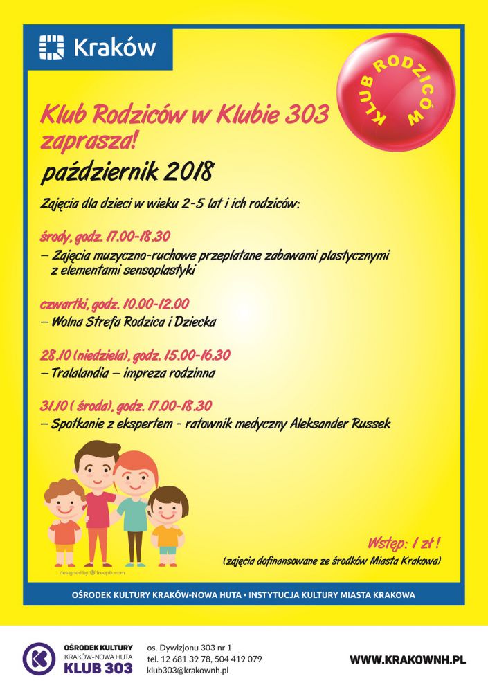 Klub 303 Orodka Kultury Kraków-Nowa Huta (os. Dywizjonu 303 nr 1) zaprasza w czwartek 25 padziernika w godz. 10.00-12.00 do wspólnego spędzania wolnego czasu, integracji Rodziców, Opiekunów i dzieci. Uczestnicy spotkania mogš skorzystać z sali zabaw lub sali sportowej z gigantycznym tunelem, piankowym torem przeszkód i innymi przyrzšdami rekreacyjnymi. Zapisy na zajęcia do 2 dni przed terminem.