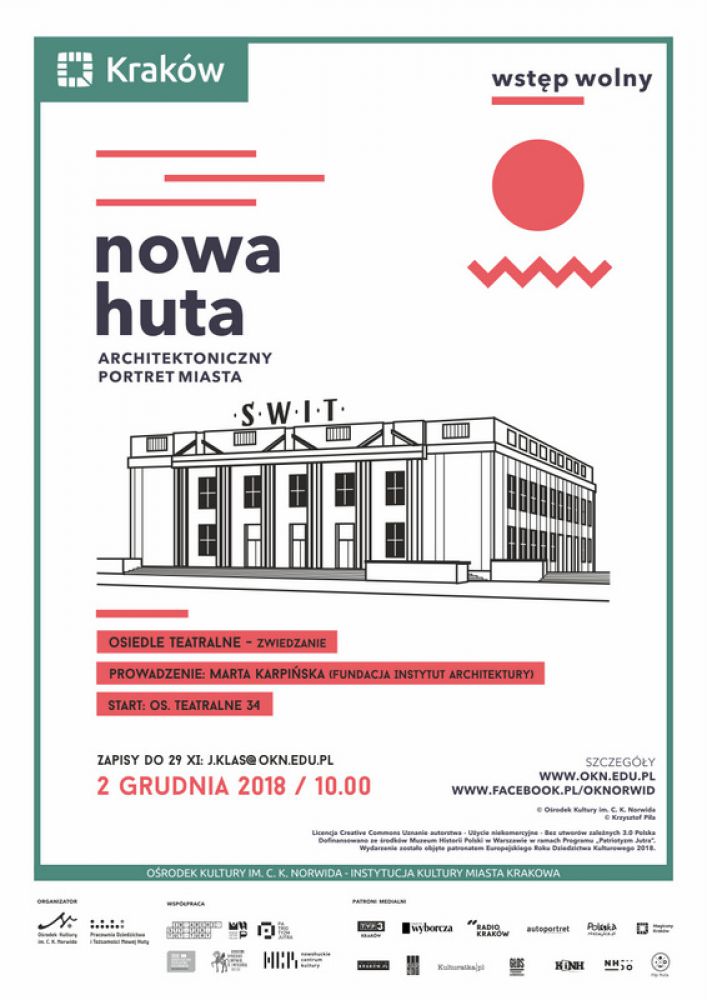 Zwiedzanie powięcone Teatrowi Ludowemu, Szkole Tysišclatce i dawnemu Kinu wit w ramach projektu Nowa Huta architektoniczny portret miasta oraz wydarzenia Sztuka do rzeczy design w Krakowie. Wydarzenie towarzyszšce: Element Urban Talks 2018. Prowadzenie: Marta Karpińska (Fundacja Instytut Architektury). Zapisy do 29 XI: j.klas@okn.edu.pl. Wstęp wolny.